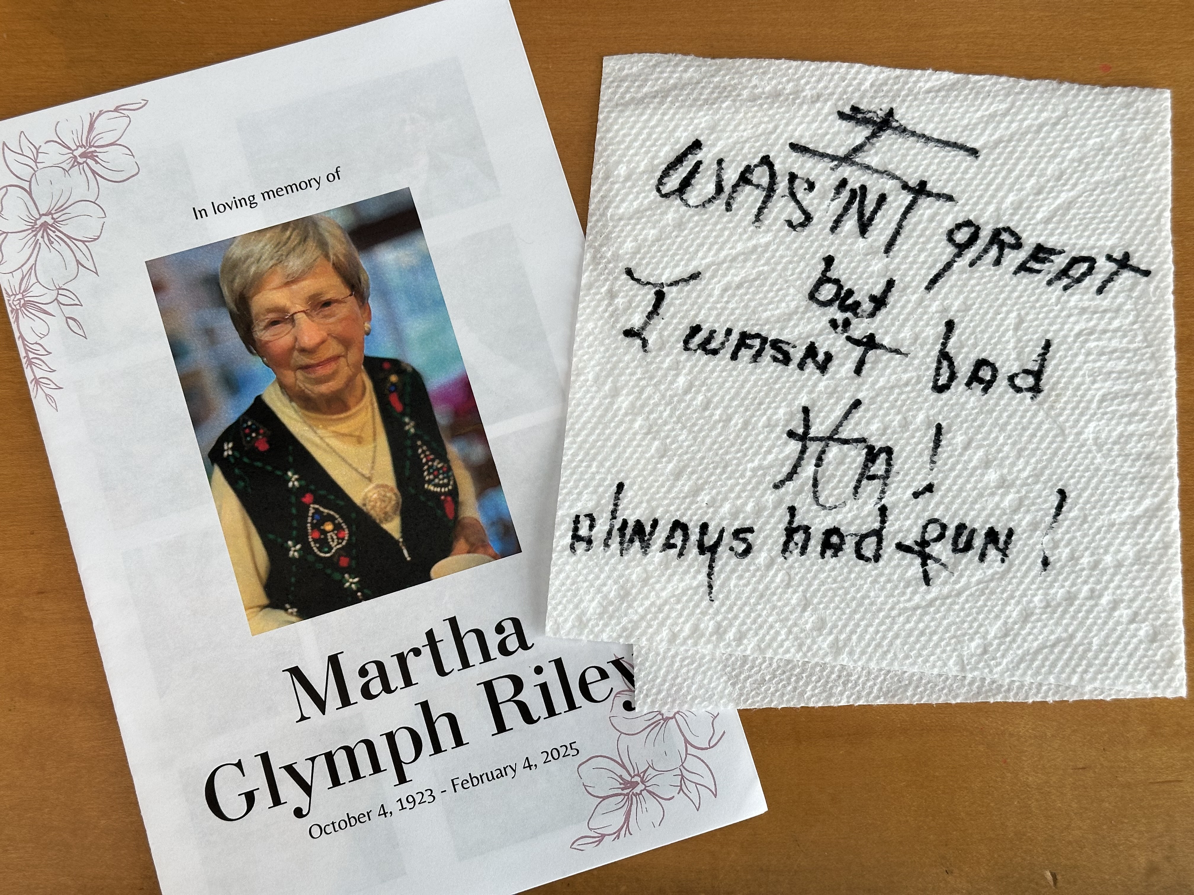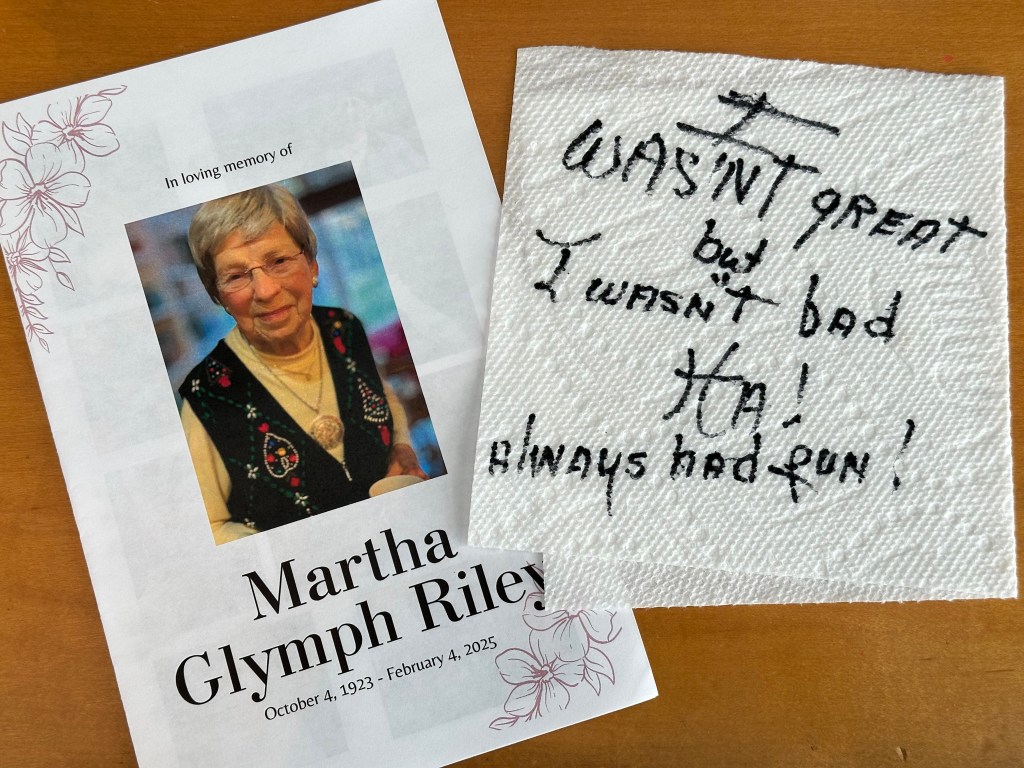 She wrote, in black Sharpie, on a piece of paper towel, what could have been her epitaph, “I wasn’t great, but I wasn’t bad. Ha! Always had fun!”