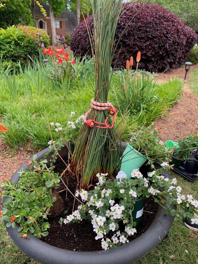 Then, we dug and planted. Dug some more. Planted some more. Mixed up soil. Dug some more. Dug up daisies, separated them and moved them to a new spot. Same with some grasses. All of this was Sunday.